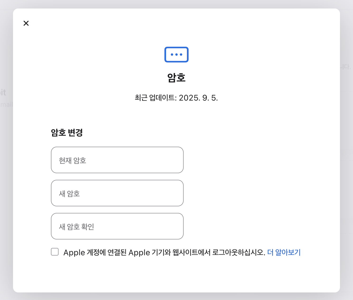 Apple 계정 관리 페이지의 로그인 및 보안 > 암호 메뉴를 보시면, 최근 비밀번호 업데이트 일자와 함께 클릭 후 비밀번호 변경이 가능합니다.
