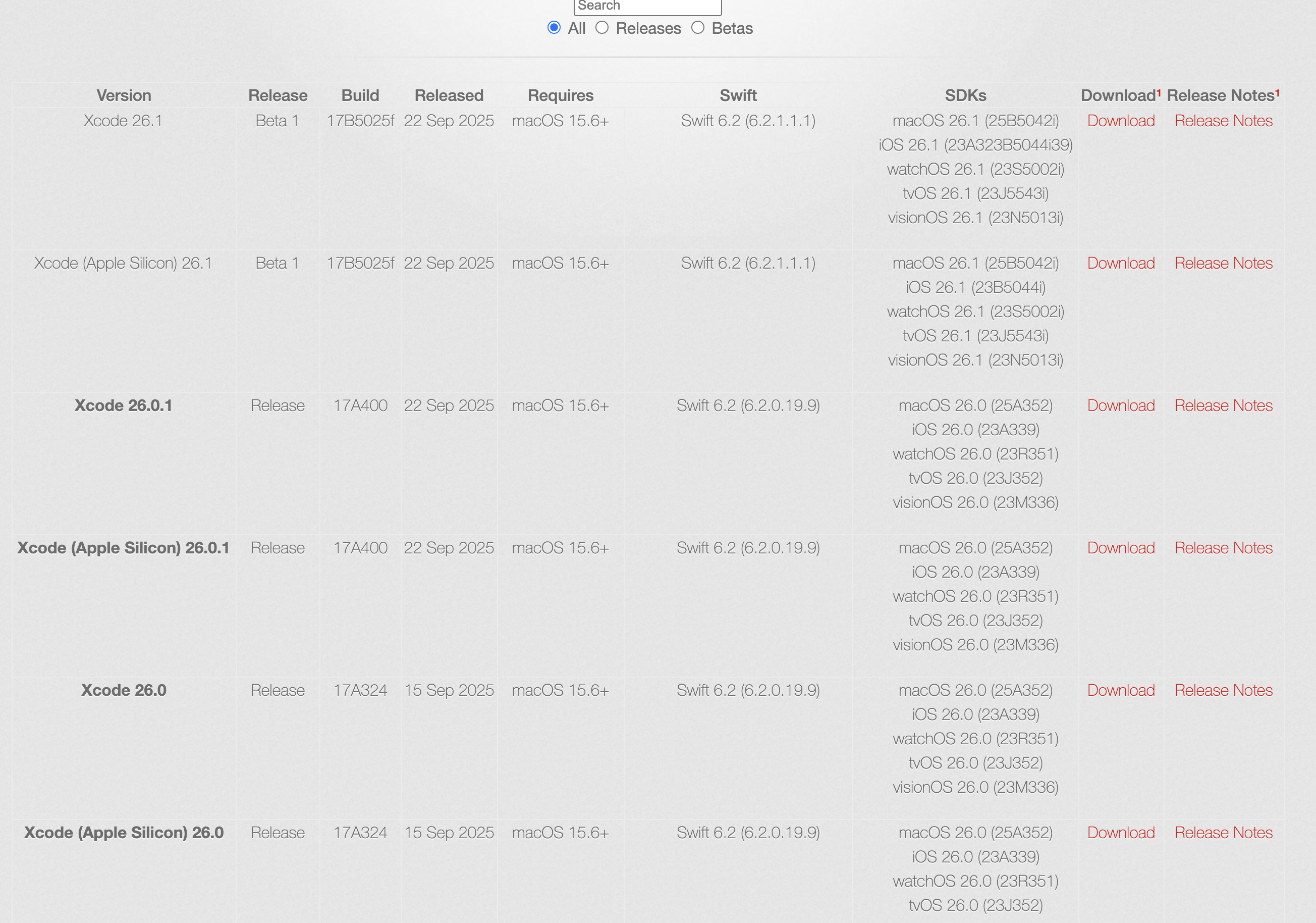 먼저, iOS26 테스트를 위해서는 iOS26 시뮬레이터를 지원하는 Xcode 26.0 release 버전을 다운로드해야합니다.