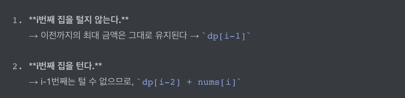 핵심은 현재 집을 털지, 건너뛸지 선택하는 것인데요. 이를 점화식으로 정리해서 해결할 수 있습니다.