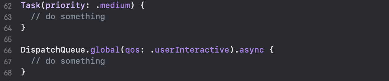 | GCD (DispatchQueue) | qos 매개변수에 DispatchQoS.QoSClass (예: .userInitiated, .background)를 큐에 직접 지정합니다. |