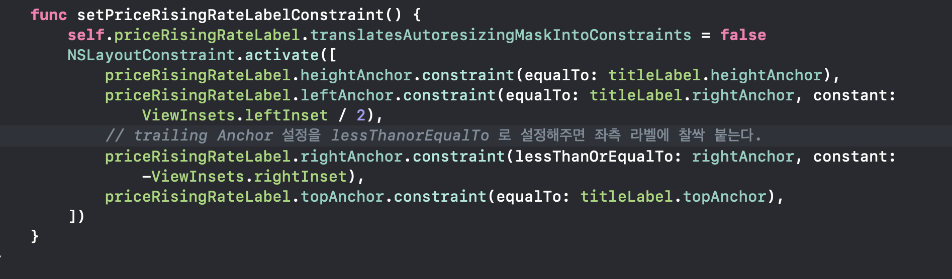 증감율 서브라벨의 제약설정 상태입니다. 이 라벨 또한 너비설정이 안되어있네요. 메인 타이틀라벨의 길이에따라 위치가 바뀌기 때문에 이렇게 설정을 해봤습니다.