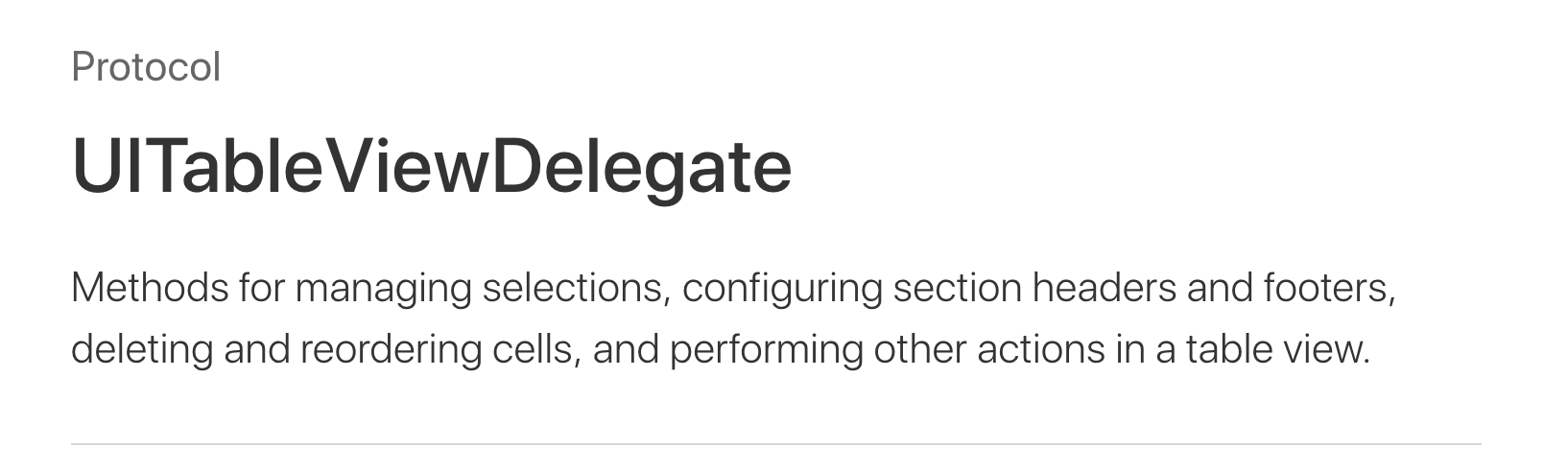 UITableViewDelegate는 테이블 뷰의 셀 재정렬, 삭제 등의 편집 그 외 다양한 액션처리를 관리하며, 섹션 헤더뷰, 푸터뷰의 설정, 셀의 선택 이벤트등을 관리하는 메서드가 정의되어 있습니다.