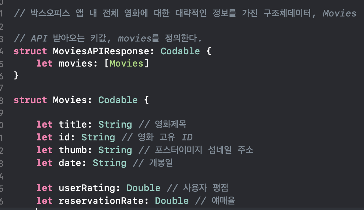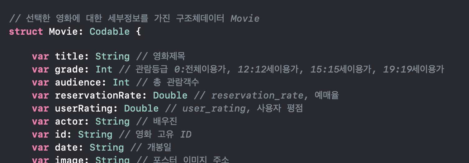 위의 movies데이터의 경우, JSON데이터의 다수의 객체정보를 담는 경우라 위처럼 구조체배열형태를 추가로 정의했는데요. 단일객체를 담는 JSON데이터, "Movie"는 키값이 없는데도 위와 동일한 배열형태([Movie])로 변수를 만들다보니 계속 "~~data is missing" 같은 오류문구가 뜨는 것이었습니다.