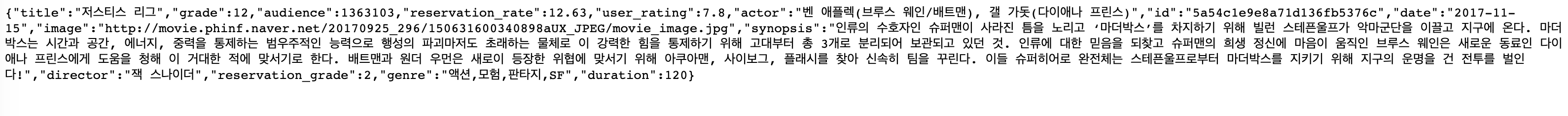 위 내용의 경우 다수의 객체가 배열형태로 이루어져있는 JSON Data형식입니다. [{},{},{}....] 해당 배열 데이터의 키값은 "movies"고, 정렬방식을 설정하는 변수는 0값을 갖고 있는 형식입니다.