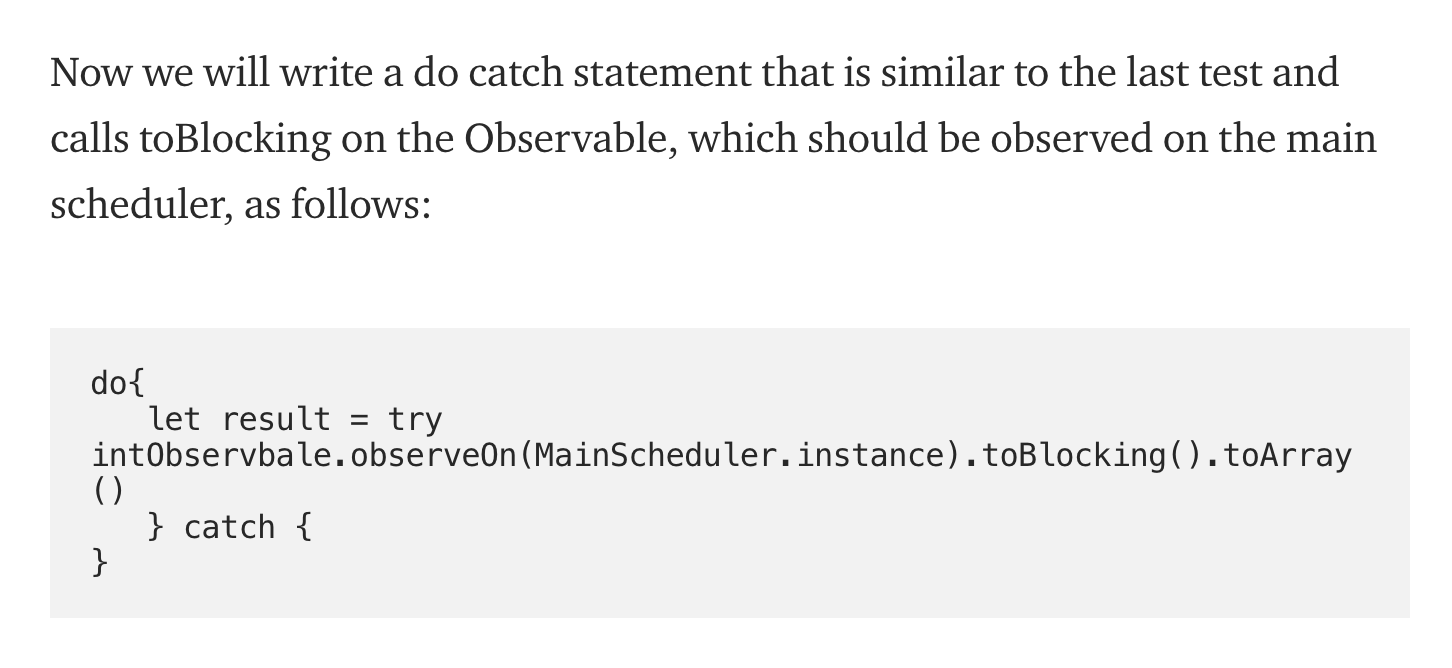 반면, RxBlocking을 사용하면 일반 Observable 시퀀스를 Blocking Observable로 변환가능 한데 이는 Observable 시퀀스가 완료되거나 지정된 시간초과시기에 도달 했을때까지 실행되던 스레드들을 차단합니다. 이는 비동기 동작의 테스팅을 보다 더 쉽게 만들어 줍니다.