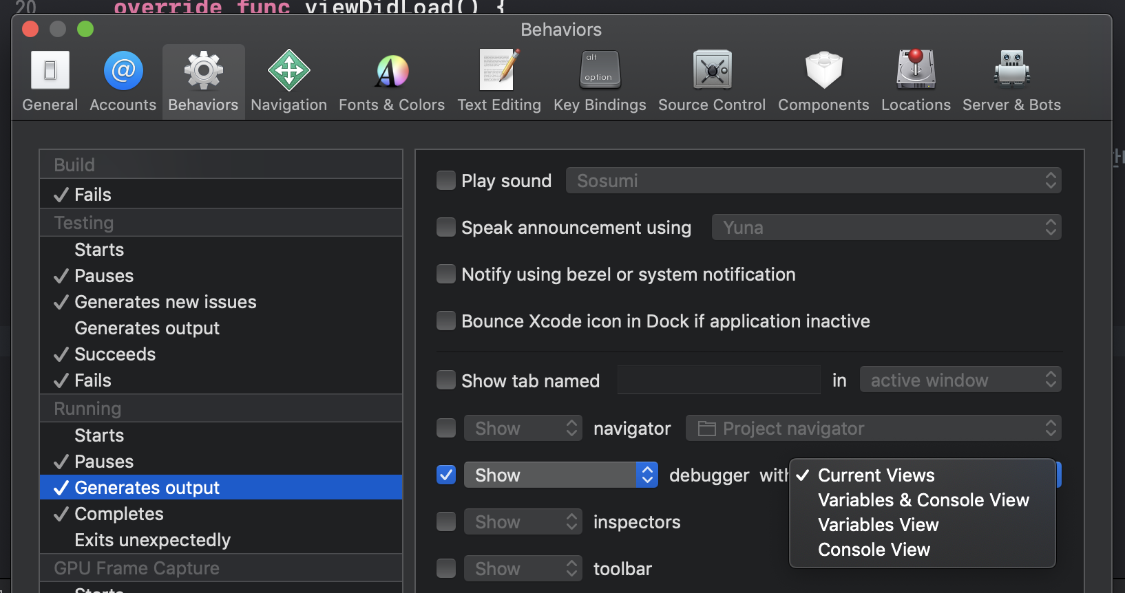 Xcode 상단 메뉴의 Behaviors -> Edit Behaviors 를 선택해줍니다.