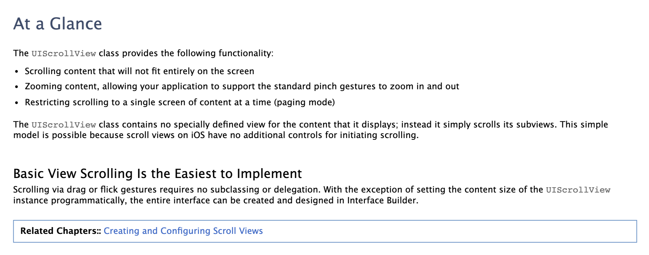 드래그나 튕기는 제스쳐를 통한 스크롤링은 추가적인 델리게이션, 서브클래싱을 요구하지 않습니다. UIScrollView 인스턴스의 컨텐츠 사이즈를 코드적으로 셋팅하는 것을 제외한 전반적인 인터페이스는 인터페이스빌더(Interface Builder)에서 만들고 설계될 수 있습니다.