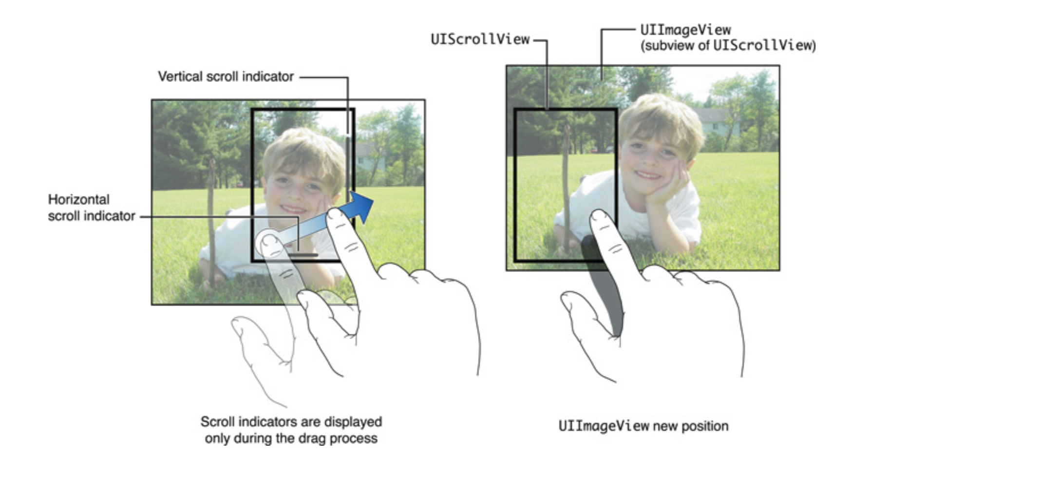 아래의 그림은 UIScrollView class의 전형적인 사용 예시를 보여줍니다. 해당 스크롤뷰의 서브뷰는 소년사진이 포함 된 UIImageView입니다. 유저가 스크린에 드래그를 하면, 이미지가 보이는 *뷰포트는 이동을 합니다. 그리고 그림을 보시듯이 스크롤 인디케이터가 나타납니다. 당신이 손가락을 올리면, 인디케이터는 내려갑니다.