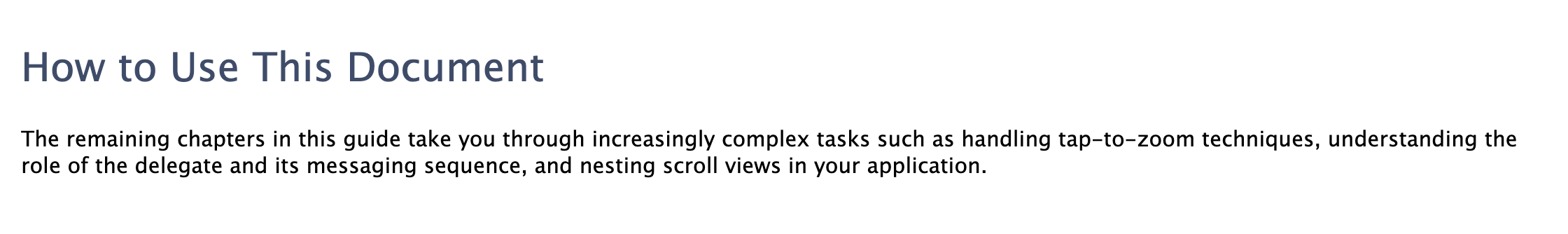 About Scroll View Programming Important: This document is no longer being updated. For the latest information about Apple SDKs, visit the documentation website. Scroll views are found in iOS applications when content that needs to be displayed and manipula