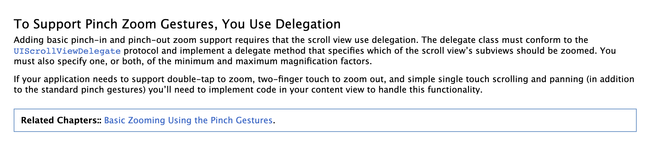 당신의 앱에 더블탭, 멀티터치, 터치, 스크롤링, 패닝, 핀치동작 등을 통한 줌 동작이 필요하다면, 당신의 컨텐츠 뷰 내에 코드를 적용해야합니다.