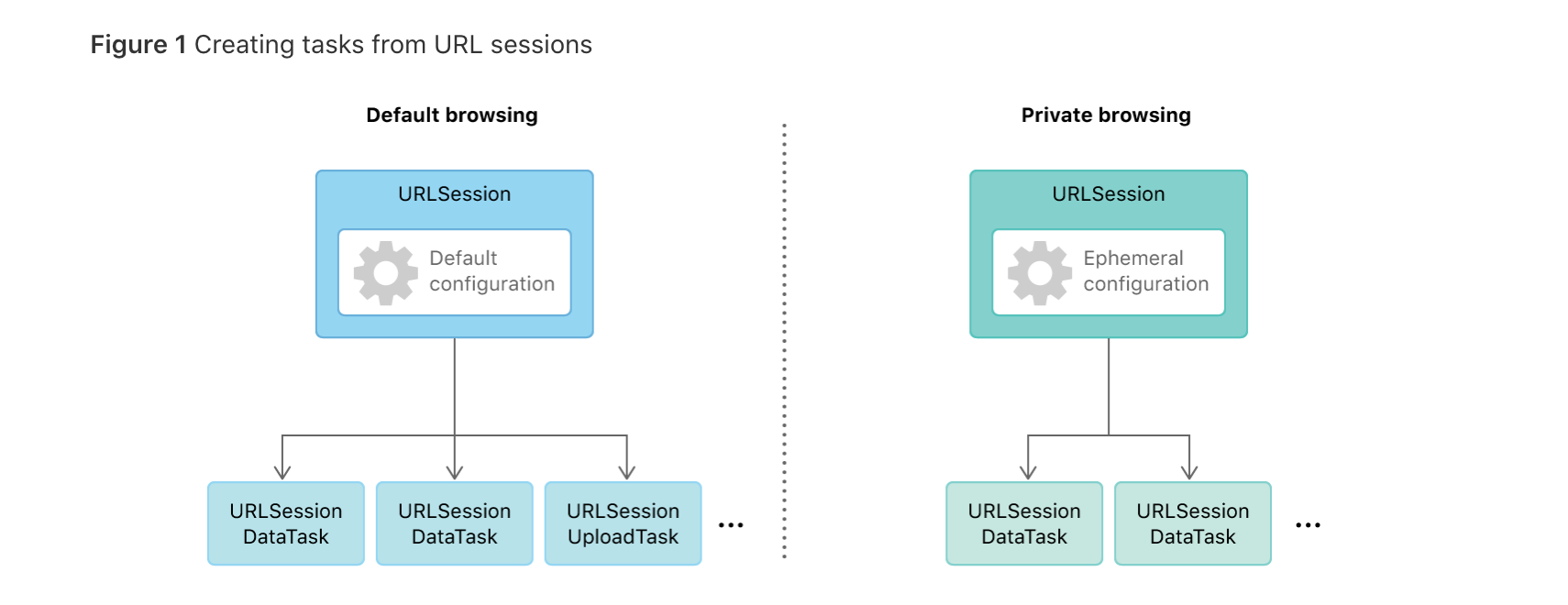 - URLSessionConfiguration은 캐시나 쿠키들을(Caches and Cookies) 사용하는 방법이나 셀룰러(cellular) 네트워크 상의 연결 허용 유무 등의 행동을 제어합니다.