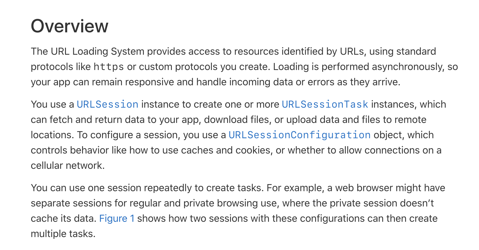 당신은 하나 혹은 그 이상의 URLSessionTask 를 만들기위해 URLSession 인스턴스를 생성할 수 있습니다. - 생성된 URLSessionTask를 통해 원격 저장소에 데이터, 파일을 업로드할 수 있고 다운로드를 통해 앱의 데이터를 일치시키거나 반환받을 수 있습니다.