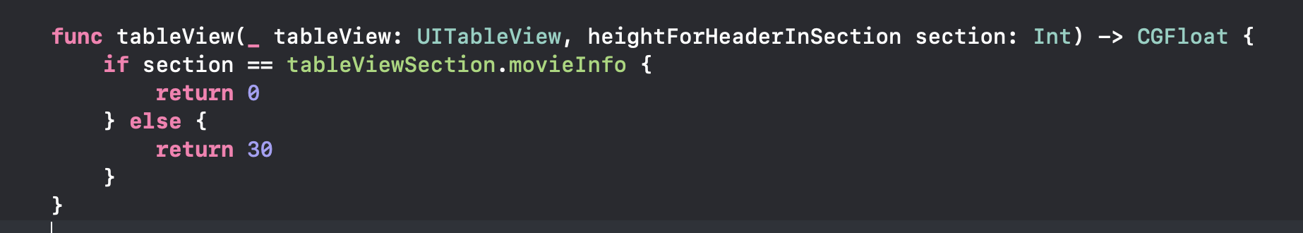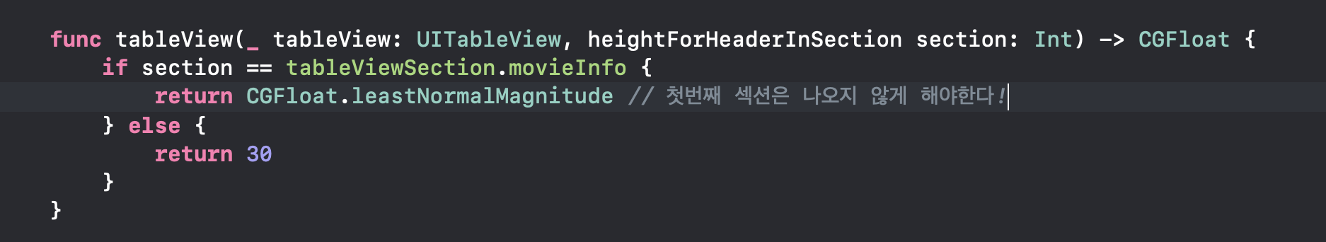 바로 Grouped상태의 TableView의 고정된 헤더섹션 중 일부 섹션헤더셀을 없애버리는 방법! 높이값을 '0'으로 주지 말고, CGFloat.leastNormalMagnitude값을 주는 것이었습니다. b