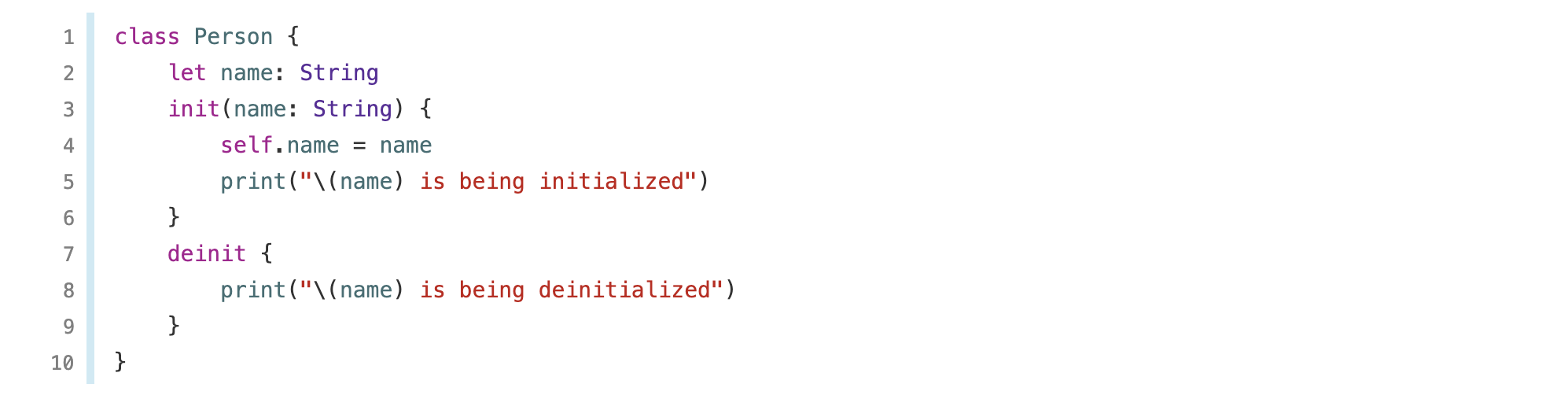 아래 코드는 ARC가 어떻게 작동하는 지의 한 예입니다. 이 예시는 Person 이라는 간단한 클래스로 시작합니다. Person 클래스는 name: String의 상수를 정의하고 있습니다.