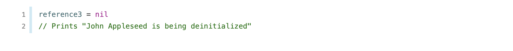 새로운 Person 인스턴스가 reference1 변수에 할당되어 졌기 때문에, reference1은 새로운 Person 인스턴스에 대한 강한 참조가 생깁니다. 최소한 하나의 강한 참조가 있으므로, ARC는 해당 Person 인스턴스가 메모리에 유지되고, 메모리에서 해제되지 않도록 보장합니다.