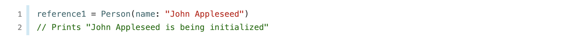 Person 클래스의 생성자를 호출하는 시점에, "John Appleseed is being initialized"가 출력되며, 이는 인스턴스 생성이 되었음을 확인시켜줍니다.
