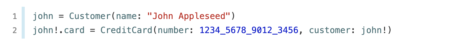 당신은 이제 Customer 인스턴스를 생성할 수 있으며 초기화 및 CreditCard 인스턴스를 customer의 card 프로퍼티로서 할당할 수 있습니다.