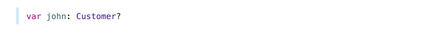 다음 이어지는 코드는 john이라 불리는 john: Customer? 라는 옵셔널 변수를 정의하며, 이는 특정 고객의 참조를 저장하기 위해 사용 됩니다. 이 변수는 옵셔널, nil로 초기화 됩니다.