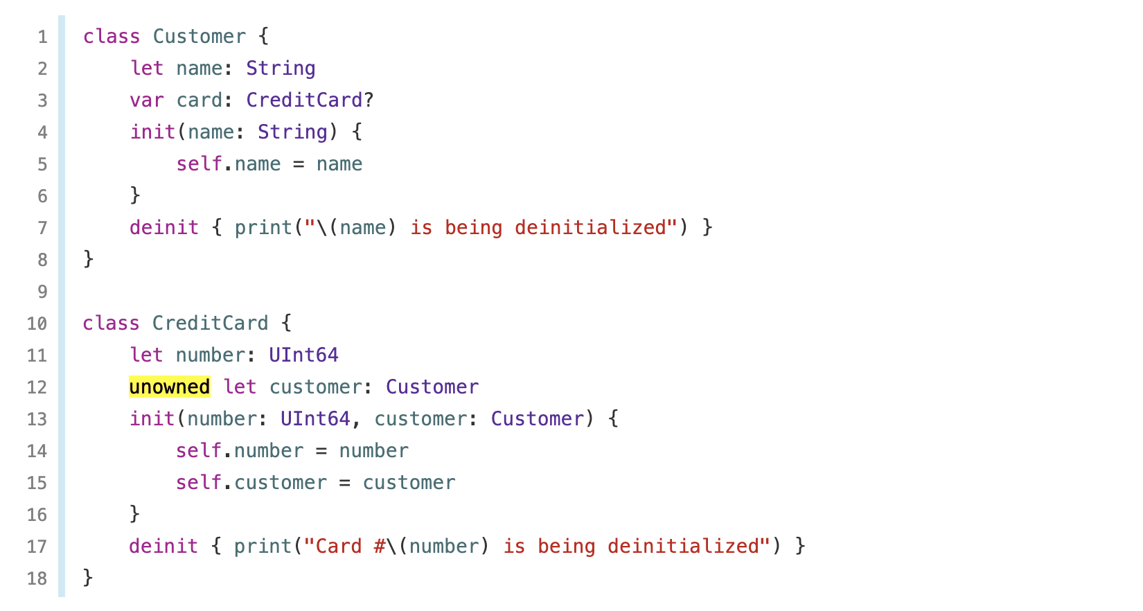 이를 대표하기 위해, Customer 클래스는 optional로 card 프로퍼티를 갖지만, CreditCard 클래스는 unowned(non-optional)로 customer 프로퍼티를 갖습니다.