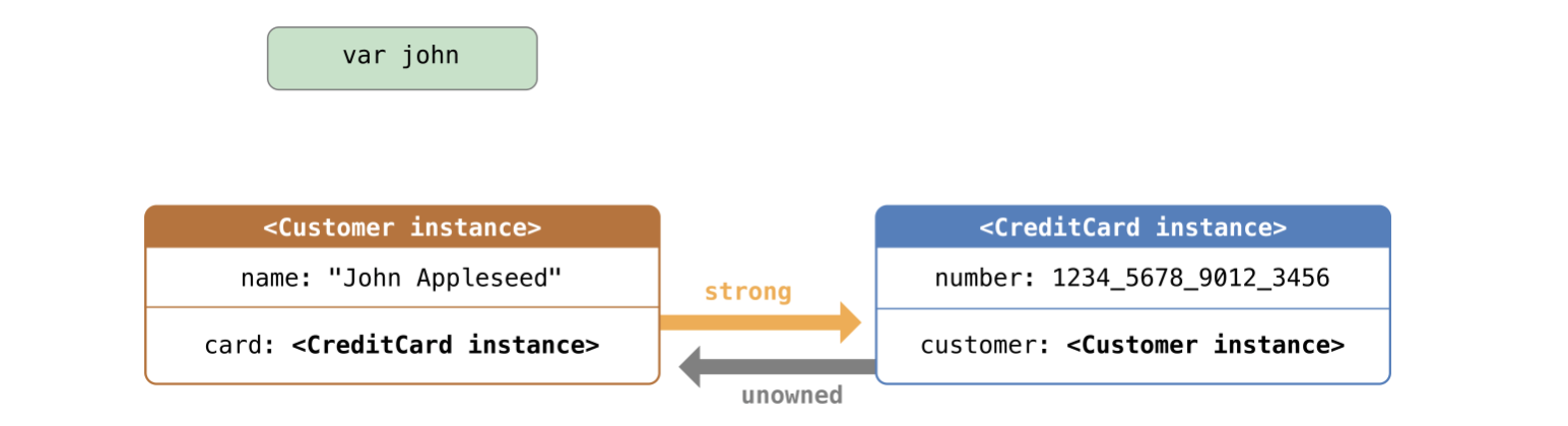 Customer 인스턴스는 이제 CreditCard 인스턴스에 대한 강한 참조를 갖습니다. 그리고 CreditCard 인스턴스는 Customer 인스턴스에 대한 미소유 참조(unowned reference)를 갖습니다. customer에 대한 미소유참조 때문에 john 변수의 강한참조가 깨질 때, 어떠한 강한참조순환도 발생하지 않습니다. (미소유참조는 약한참조와 동일하게 참조할때 강한참조를 갖지 않기 때문입니다.)