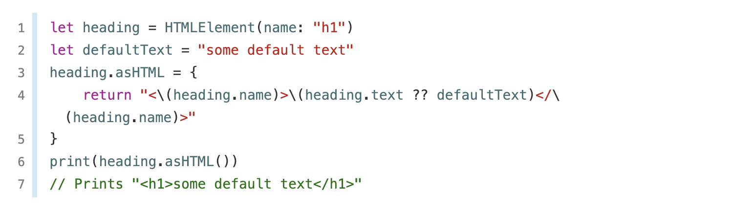 예를들어, asHTML 프로퍼티는 text 프로퍼티 값이 nil일 경우 디폴트 텍스트로 설정되는 클로져를 설정할 수 있습니다. 텅 빈 HTML 태그를 반환하여 표현하는 것을 방지하기 위해서 말이죠.