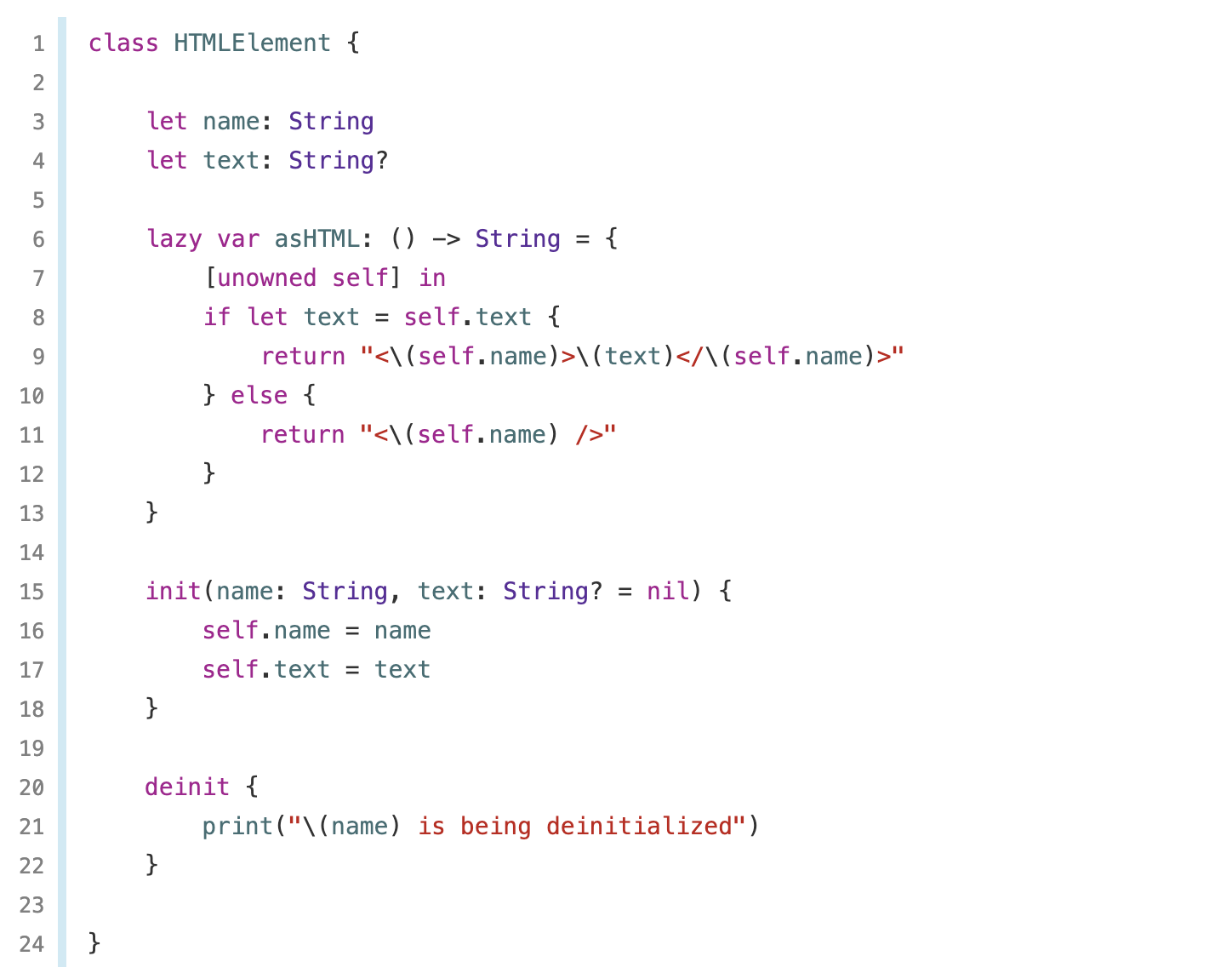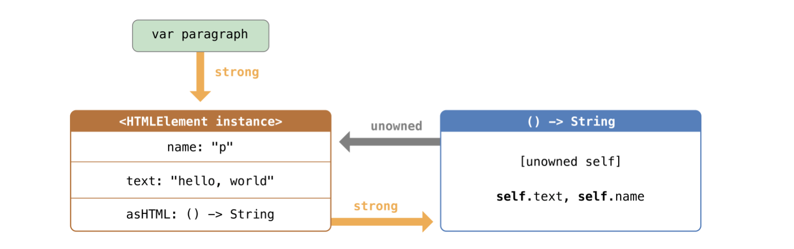 위의 코드는 이전의 HTMLElement 예시의 코드와 단 한가지 빼고 동일합니다. 바로 asHTML 클로져 안의 캡쳐리스트가 추가된 것을 제외하고 말이죠. 위 코드의 경우 캡쳐리스트는 [unowned self] 입니다. 이는 캡쳐한 self 를 강한참조 대신 미소유참조로서 참조하겠다는 것을 의미합니다.