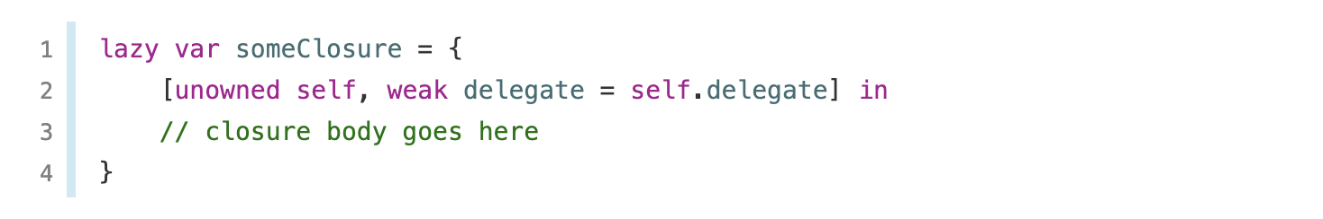 캡쳐 리스트(capture list)의 각각의 아이템은 weak / unowned 키워드 + self 참조변수 / 어떠한 값으로 초기화된 변수(delegate = self.delegate)의 쌍을 이룹니다. 이러한 쌍들은 클로져 블럭 안에서 작성됩니다. 각각의 쌍 사이에는 콤마(,)로 구분합니다.