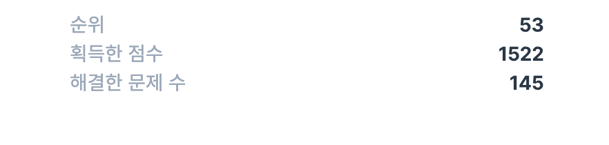 그렇게 조금씩 풀다보니 현재는 145문제 정도 풀었네요. 저는 알고리즘 문제풀이를 단순 공부라고 생각하지 않았습니다. 그렇게 딱딱하게 생각하다간 질리기 마련 일 테니까요. 저는 문제풀이를 취미, 게임이라고 생각하며 풀었던 것 같습니다. 그렇게 자기암시(?)를 걸며 푸니 비교적 재밌게 준비할 수 있었습니다.