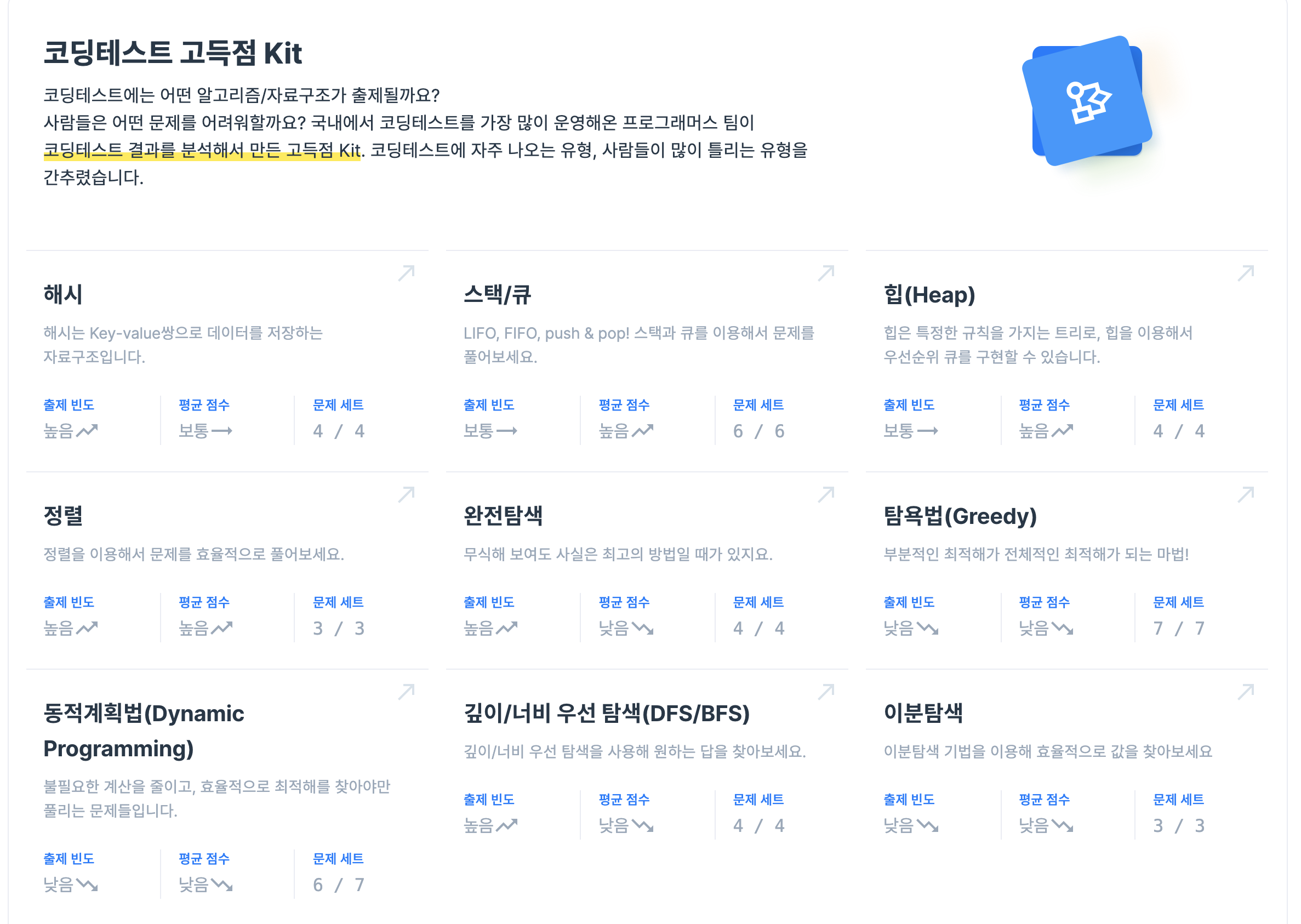 프로그래머스는 자주 나올 수 있는 빈출 문제 유형을 정리해서 풀 수 있게 고득점 킷 문제리스트를 제공하고 있는데요. 고득점 킷 문제는 유형별 알짜 문제이기 때문에 준비하면 비교적 단기간에 빈출 유형의 문제들에 대해 대비할 수 있습니다. 특히 단기적으로 코딩테스트를 준비해야한 다면 고득점킷 문제를 풀어보시는걸 추천드립니다.