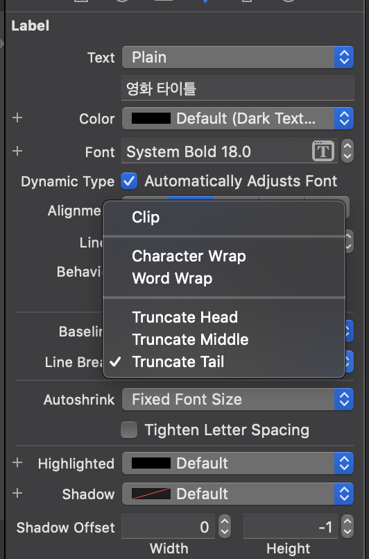 위에 보시듯이 인터페이스빌더(Interface Builder)의 Attribute Inspector를 보시면 Truncate의 옵션을 보실 수 있어요.