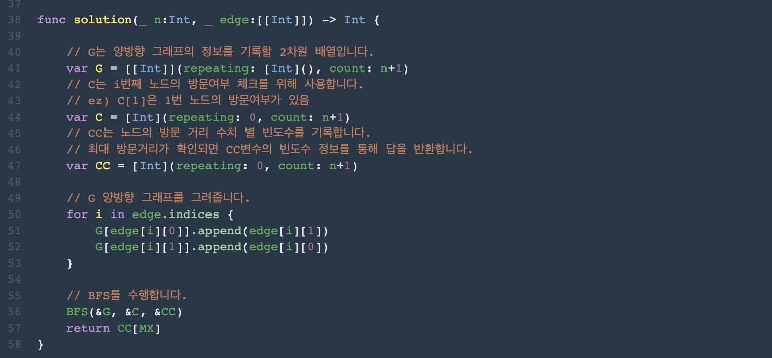 이렇게 배열을 준비 후 BFS를 진행합니다. BFS이후 가장 먼 거리의 노드 수는 CC[MX]를 반환하여 구할 수 있습니다. 앞서 CC에 대해 설명 드렸듯이, "CC[MX]" 는 곧 "가장 먼 거리의 노드 수" 이기 때문입니다.