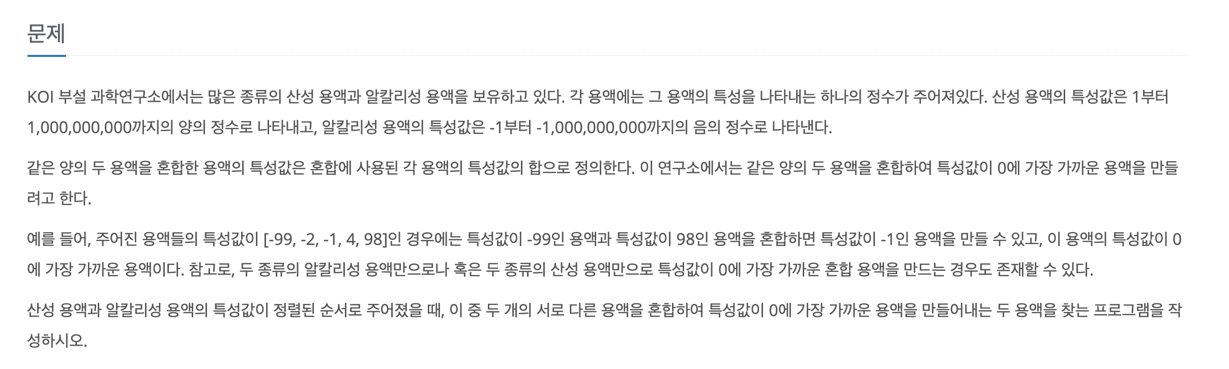 백준 용액 2467 문제 설명
