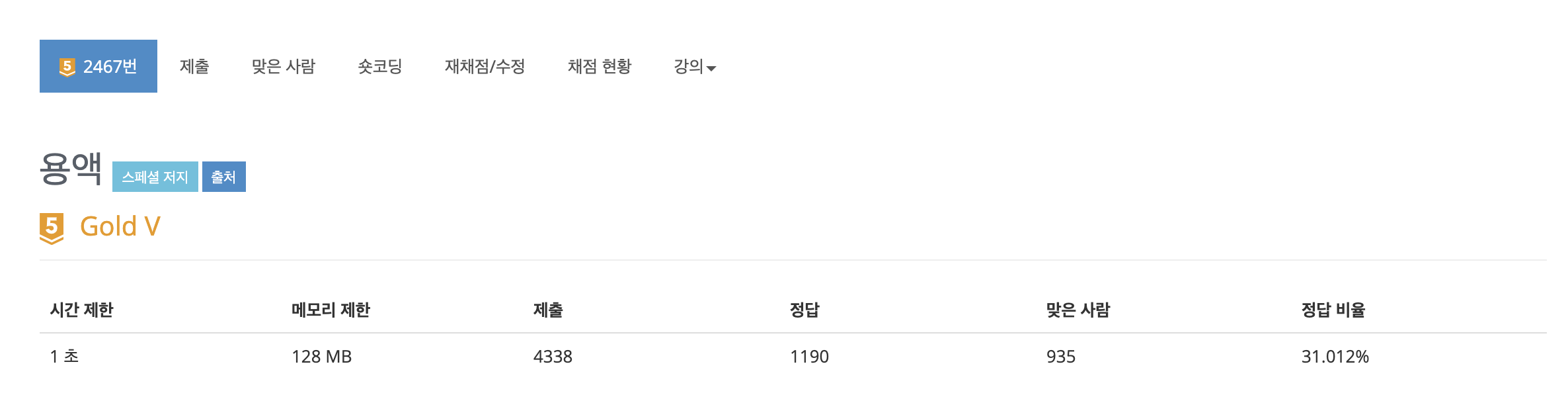 백준 2467번 문제, 용액은 골드5에 랭크되어 있습니다.