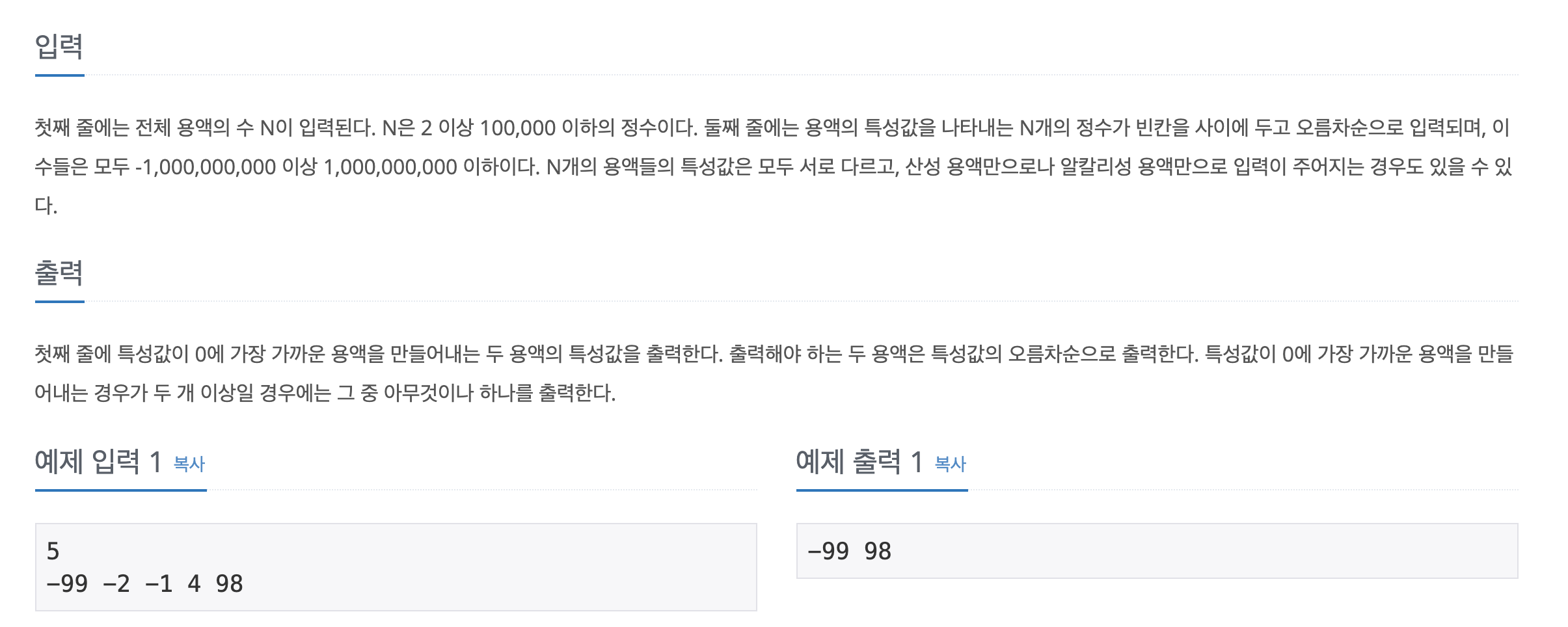 해당 문제는 오름차순으로 정렬 된 용액 특성 값이 주어졌을때 두 개의 서로 다른 숫자를 섞어 0에 가장 가까운 용액을 만들어 내는 경우의 두 용액을 찾는 문제입니다.