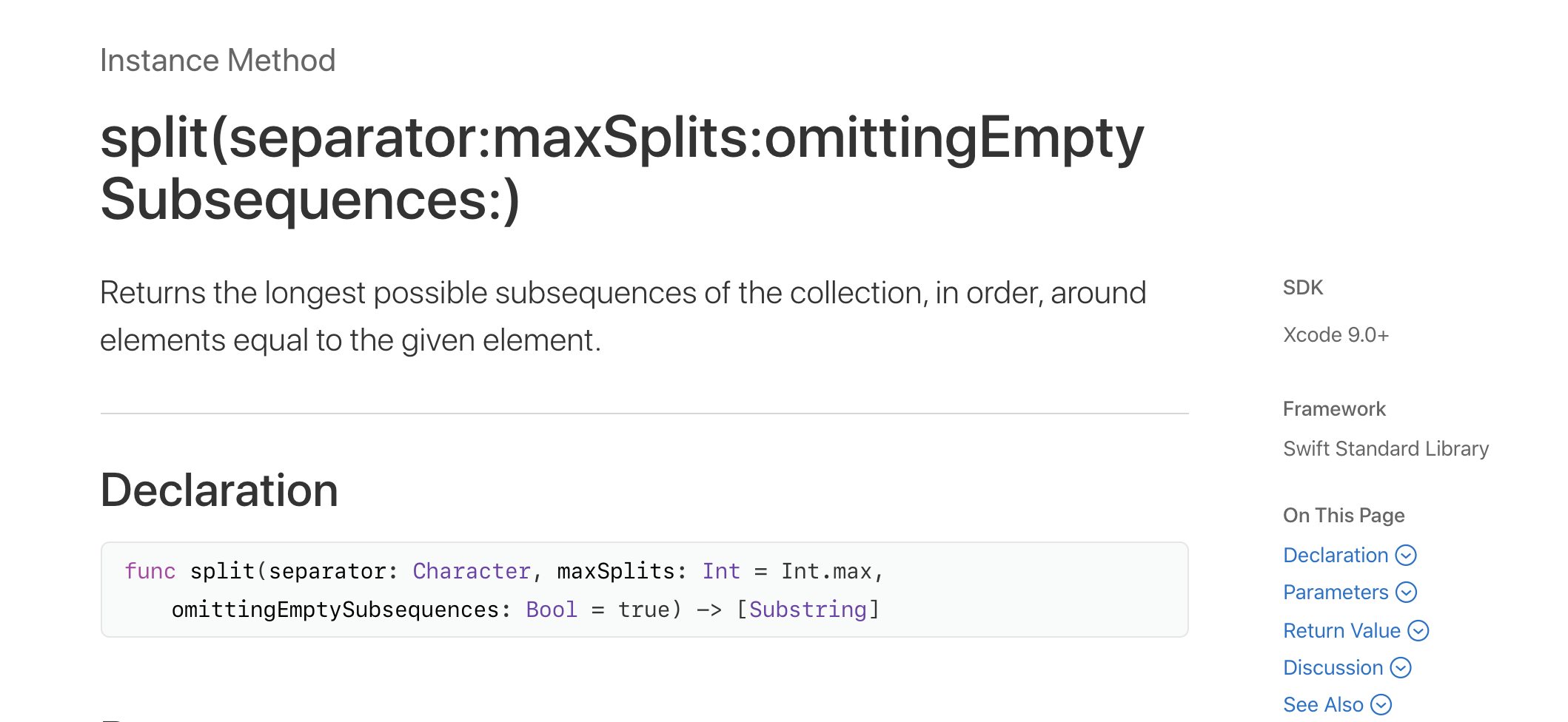 앞서 말했던 것처럼, split함수는 swift standard library에 속해있어 별도로 import Foundation 할 필요 없이 사용할 수 있습니다.