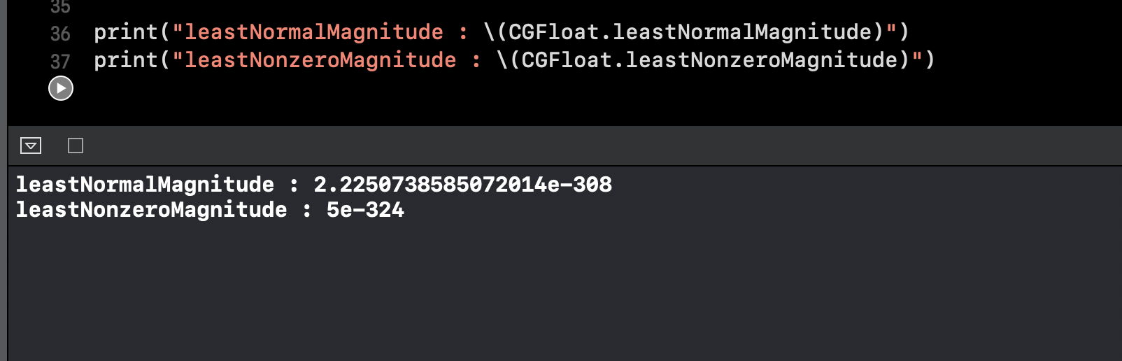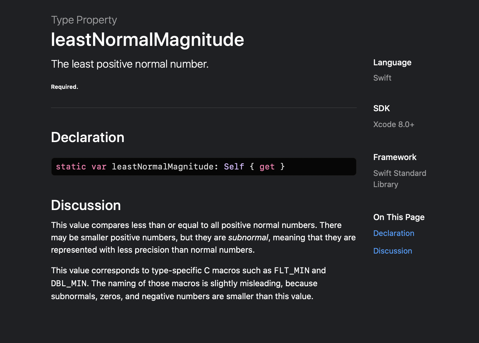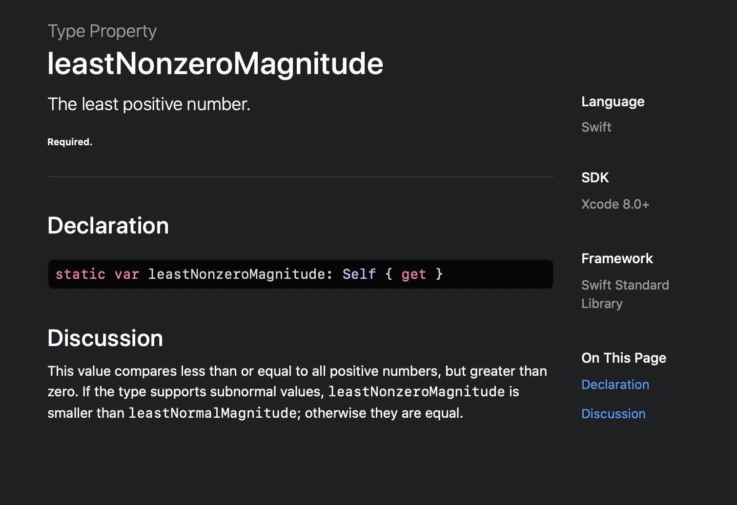 leastNonzeroMagnitude는 모든 양의 숫자들 보다 작거나 같은 값을 반환합니다. 하지만 0보다는 큽니다. subnormal values(비정규 값?)를 지원한다면, 또 다른 타입프로퍼티, leastNormalMagnitude보다도 값이 작다고 합니다.