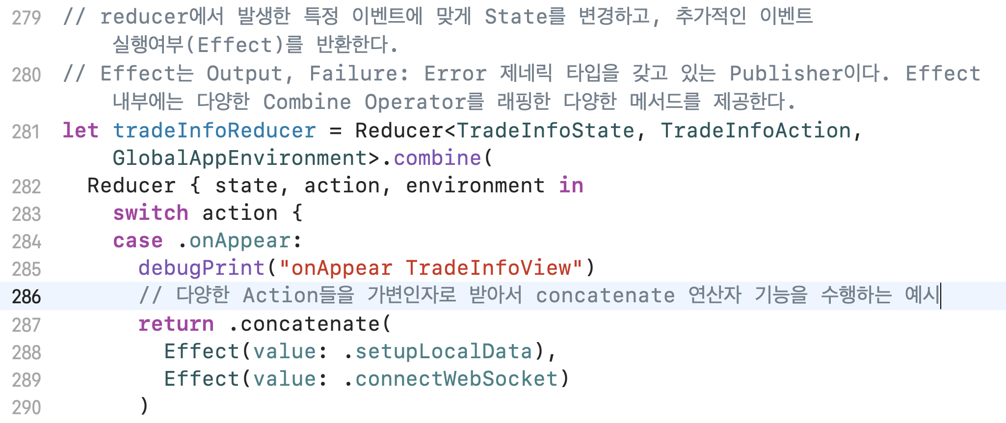 위 코드는 보시면 .onAppear 이벤트가 발생했을때 Effect의 concatenate 래핑 연산자를 통해 다양한 Effect들을 순차적으로 실행하는 것을 보실 수 있습니다.