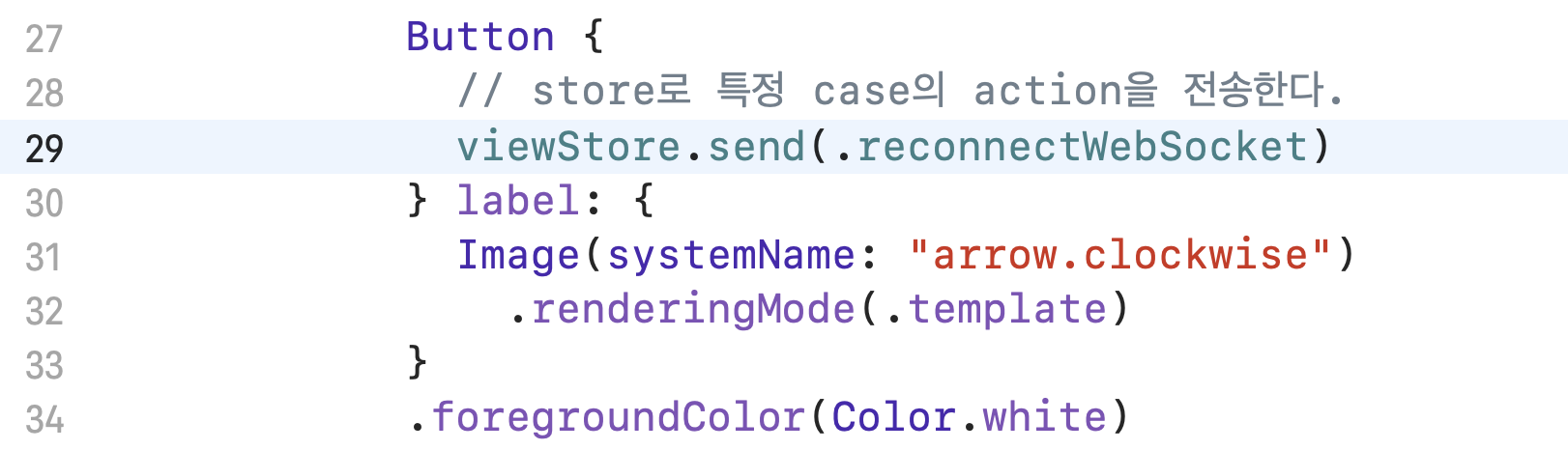 위 코드는 특정 버튼을 눌렀을때 reconnectWebSocket 이벤트를 전송하는 모습입니다. viewStore.send(_:)를 통해 특정 이벤트를 전송하며, reducer는 해당 이벤트에 맞는 동작을 실행합니다.