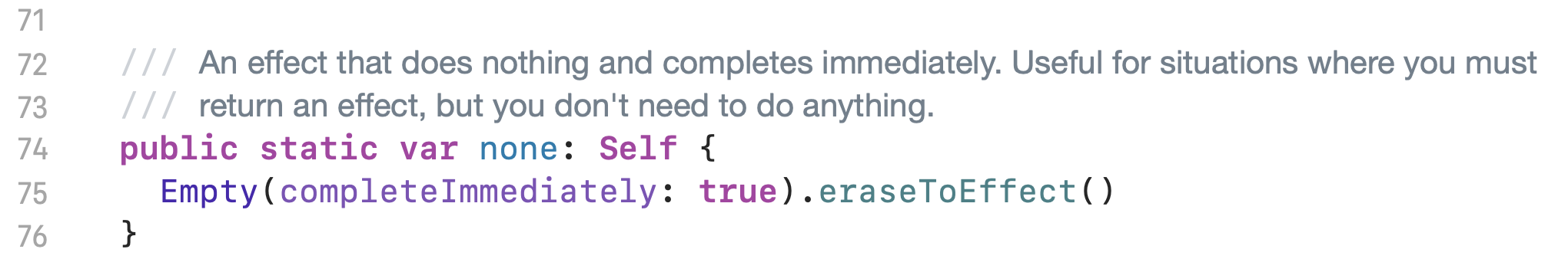위 코드는 Effect에 구현되어 있는 타입 프로퍼티 입니다. 더이상 수행할 Action이 없다면, .none을 반환하면 됩니다.