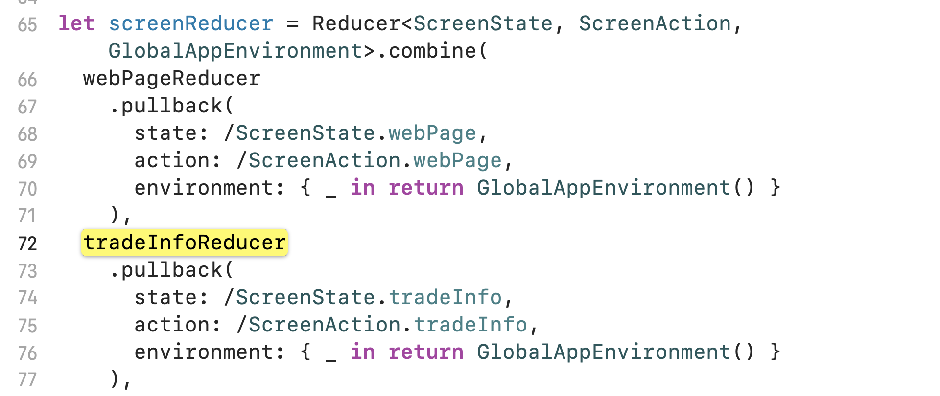 이러한 Reducer들은 서로 분해하고 결합할 수 있습니다. pullback을 통해 다양한 기능 화면의 reducer들이 local -> global하게 사용될 수 있도록 변경하고, combine으로 하나의 reducer로 결합할 수 있습니다. 위에서 사용된 combine 메서드를 보겠습니다.